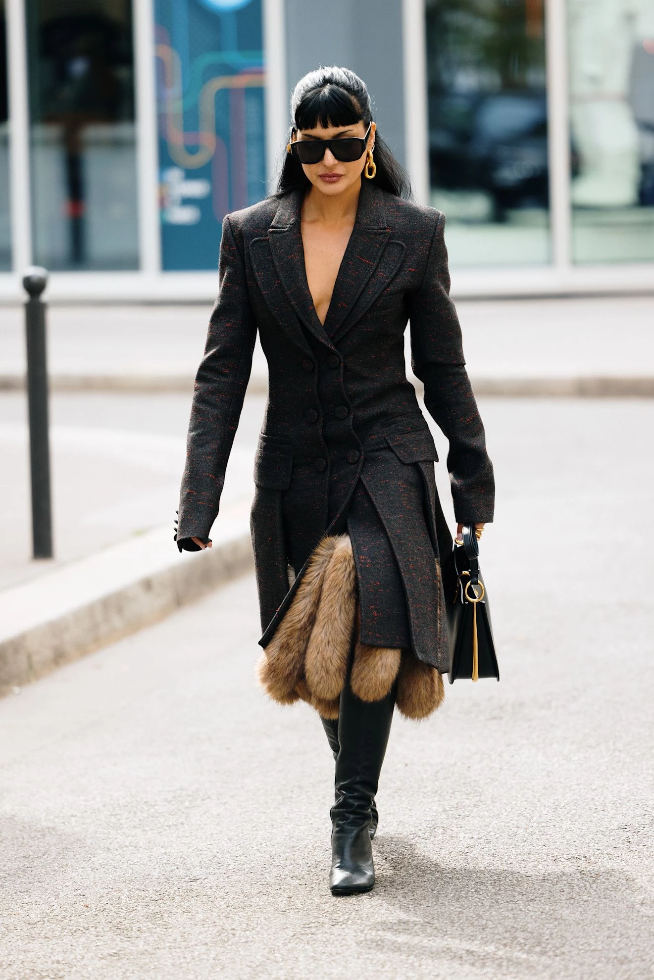 Мова не про масивні шуби зі штучного хутра, а про маленькі акценти: мінісумка з "пухнастою" ручкою, мюлі з хутряним кантом чи мікрошарф, перев’язаний як "пухнастий" чокер. Це грайливо, святково та дуже "тактильно": доповнює total black і додає глибини стриманим образам. Хочете більше драми? Поєднуйте текстури – атлас і хутро, оксамит і хутро.