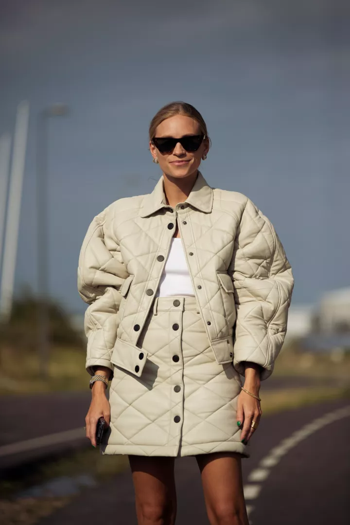 Фото: RAIMONDA KULIKAUSKIENКостюмы и сеты из двух и более стеганых предметов являются громким заявлением о своих намерениях. Сочетайте их с базовыми оттенками и минималистичными аксессуарами. Бежевый total look – лучший способ достичь успеха.