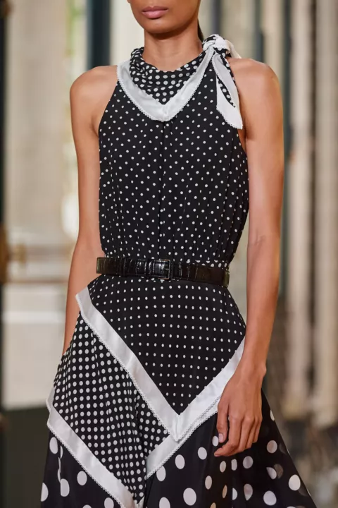 В текущем сезоне дизайнеры вновь показали множество вариаций этого универсального принта. Модные Дома предлагают не стесняться и миксовать круги разного диаметра – как в коллекциях Altuzarra, Marc Jacobs и Sacai. Главным трендом стал монохромный "гороховый" образ – в весенне-летней коллекции Balmain и Haider Ackermann презентовали брючные костюмы в классических черно-белых цветах. Нестареющая классика – красное ретро-платье в горох – возродилась в коллекции Michael Kors Collection прямиком из эпохи стиляг: конечно, с драпировкой и характерными оборками.