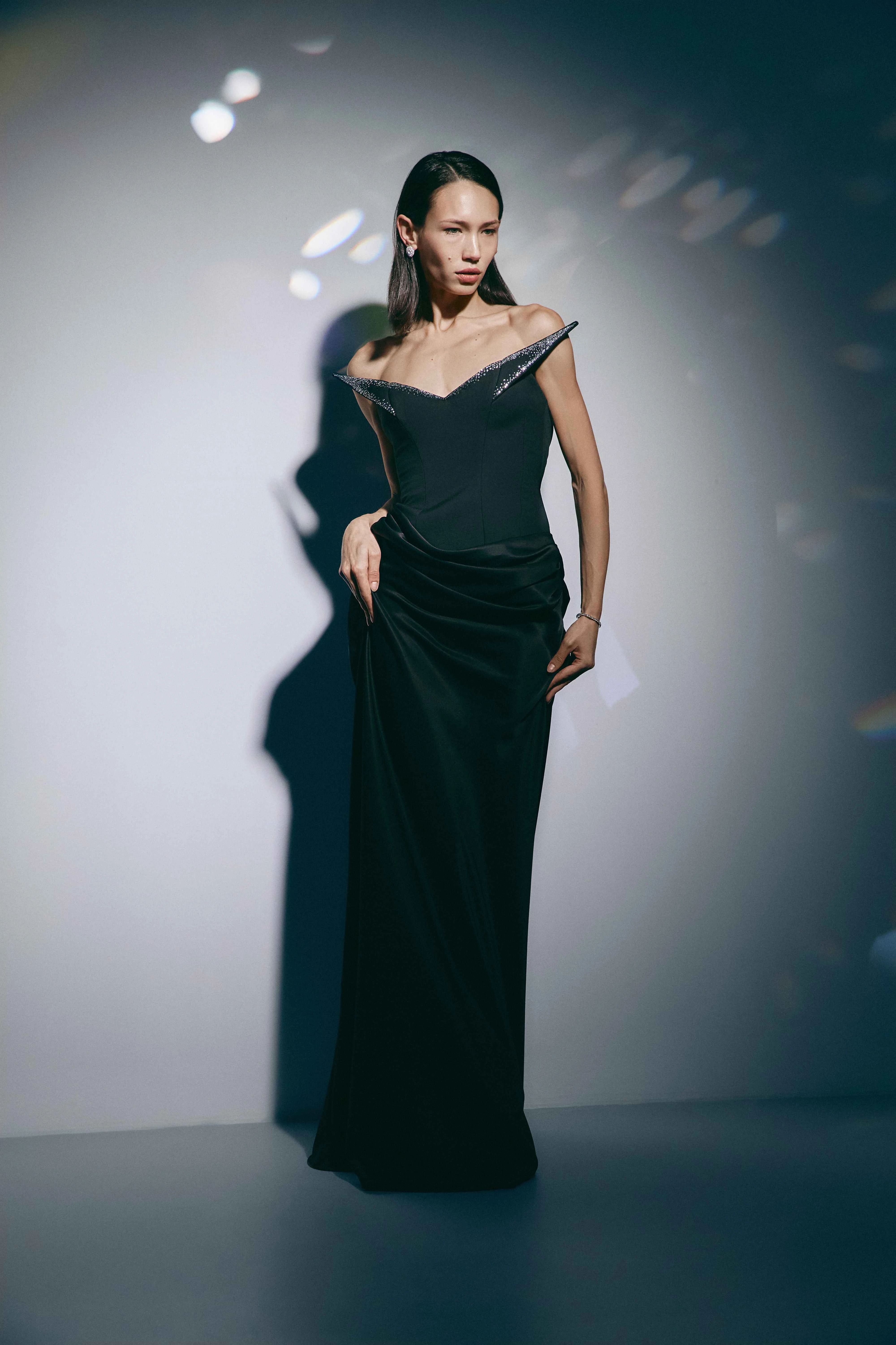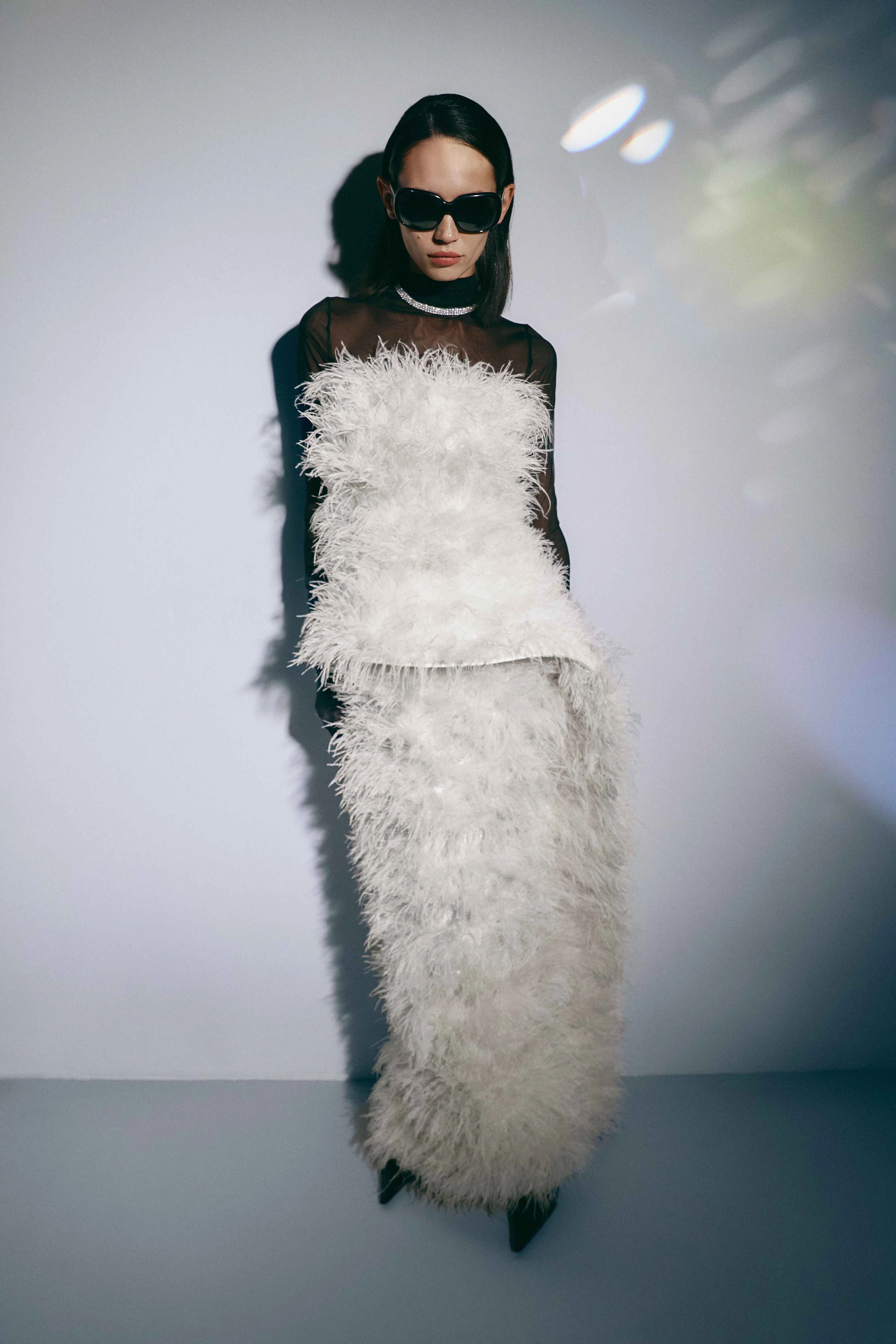 У новій святковій колекції Anna October відчувається магія старого Голлівуду: пастельно-рожева сукня з дрібними діамантоподібними вставками та збірками тканини, драматичний корсет із чорного марабу, сукні з делікатною вишивкою квітковими намистинами на прозорих діамантоподібних панелях і декоровані спідниці. Бордові акценти гармонійно переплітаються із зимовими відтінками білого, які повторюються в усій колекції, включно із сліп-сукнями та светрами з регульованими шнурівками.