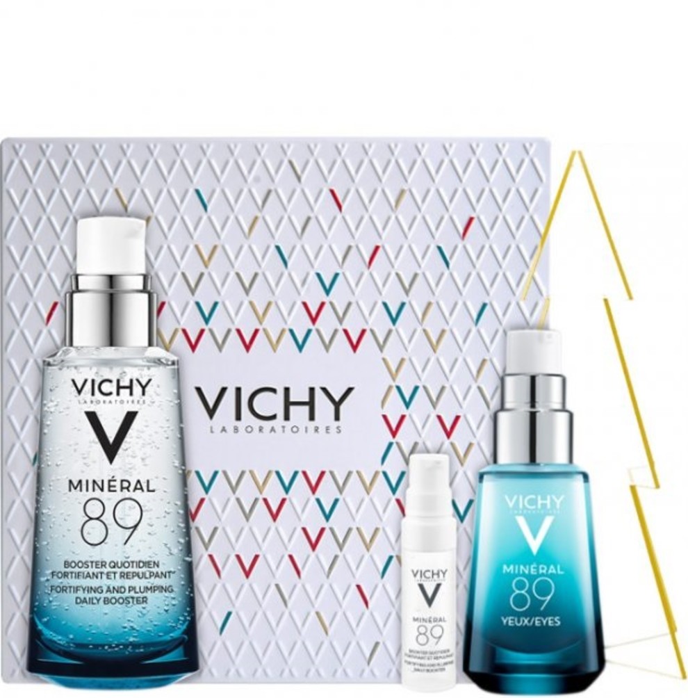 Набір Vichy 89 святково упакований і може стати чудовим подарунком — собі, сестрі, мамі, подрузі. У складі 89% термальної води Віші та гіалуронова кислота; бустер — перший етап у догляді; він може бути базою під будь-яку сироватку або макіяж, а гель під очі містить кофеїн, щоб ранок після новорічної вечірки був добрим.