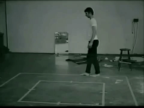 "Ходьба периметром квадрата з гіперболізованими рухами", Брюс НауманЗ кінця 1960-тих Науман створює серію інсталяцій-коридорів. Одна з найцікавіших – "Записаний наживо відеокоридор". Людина рухається вузьким проходом, на початку якого стоїть камера, що записує відео, а в кінці – монітор, який це відео транслює.