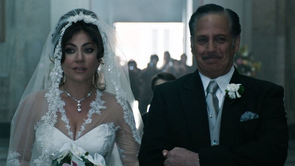 Кадр з фільму "Дім Ґуччi"Весільну сукню, у якій з’явилася Леді Ґаґа, було прикрашено бездоганними мереживними деталями як данина поваги актрисі Джині Лоллобріджиді. Насправді Патриція Реджіані вибрала для весілля з Мауріціо Ґуччі лаконічний образ.