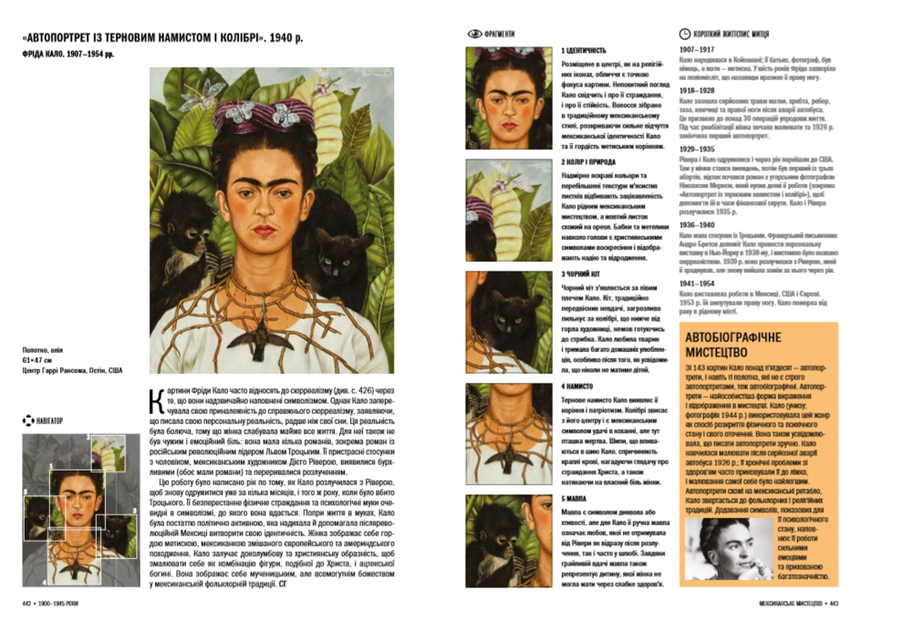 Найбільш непростими для формування цілісного уявлення про культурну епоху є останні частини книги – від початку XX століття і до наших днів. У Фартінга є свій прийом: найскладніше з цього періоду він пояснює в найдрібніших деталях. Наприклад, чи знали ви, що Фріда Кало заперечувала, що її роботи належать до сюрреалізму? За формою і змістом напрям визначений правильно – роботи наповнені символізмом і змістами, але ось сама художниця визначала свою творчість як окрему реальність і заперечувала, що працювала в якомусь конкретному напрямку. Творчість Фріди є автобіографічною – це був її почерк і головна особливість: емоційність і трансляція особистісних переживань і станів світу.