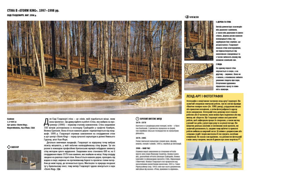 Окрему увагу в книзі автор приділяє фотографії, інсталяції, перформансу, ленд-, відео- і урбан-арту. Сучасне мистецтво, пише Стівен Фартінг, руйнує звичні межі і виходить за рамки, застосовує все нові і нові ідеї. Наприклад, земля – як полотно: замість того, щоб зображувати природу, в цьому напрямку її використовують для створення шедеврів. Мистецький центр "Storm King" у Нью-Йорку (а, по суті – парк) – місце, в якому зібрані різні ландшафтні роботи. У цьому парку Енді Голдсворті спорудив стіну, яка живе своїм окремим життям: у неї немає мети підпирати або захищати – вона просто в'ється між дерев, занурюється в озеро і виринає з нього на іншому березі.