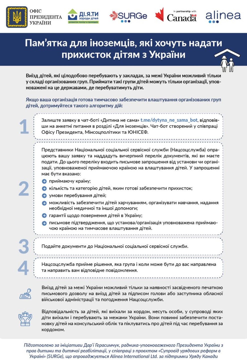 Важливо. Виїзд дітей, які цілодобово перебувають у закладах, за межі України, можливий тільки в складі організованих груп. Приймати такі групи дітей можуть тільки організації, уповноважені на це державами, де перебуватимуть діти.