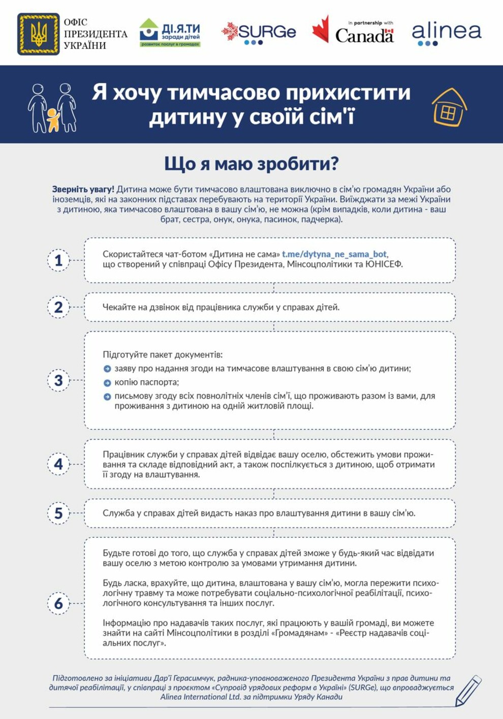 Важливо. Дитина може бути тимчасово влаштована тільки в сім’ю громадян України або іноземців, які на законних підставах перебувають на території України. Виїжджати за межі України з дитиною, яка тимчасово влаштована у вашу сім’ю, не можна (крім випадків, коли дитина – ваш брат, сестра, онук, онука, пасинок, падчерка).