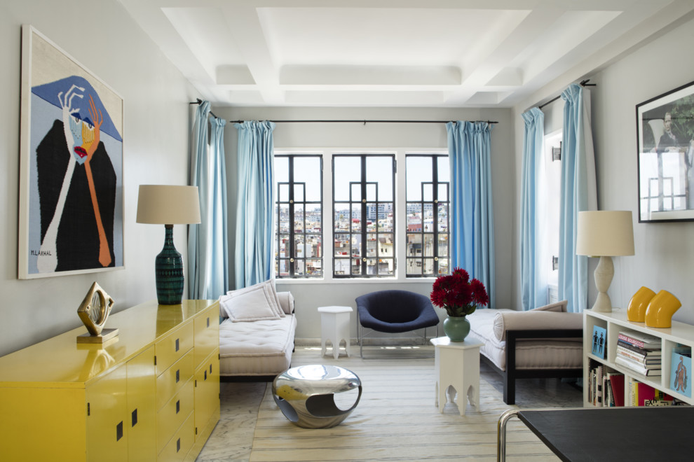 Студія. Жовтий лакований комод 1970-х років господарі знайшли в Лондоні в магазині Paul Smith. Металевий табурет – модель Capsule роботи Ерве ван дер Стратена. Кушетки з оббивкою із тканини Dedar – робота місцевого майстра. Синє італійське крісло 70-х років було куплено в Benoît BardelliНа щастя, ван дер Стратен і Фрізона не прагнуть стати центром загальної уваги, хоча могли б. Фрізона – арт-директор взуттєвої марки Roger Vivier з дня її заснування у 2003 році. Серед його клієнтів – Кейт Бланшетт, Катрін Деньов і Леді Гага. Ван дер Стратен, мабуть, найуспішніший у світі дизайнер меблів. Його творіннями – від "пророслих" гілками ліричних дзеркал до консолей із балансуючими всупереч всім законам фізики блоків – захоплюються декоратори Жан-Луї Деніо, Мюріель Брандоліні і Робер Кутюр'є.