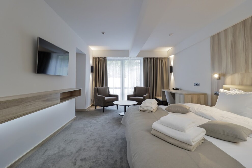 Yaremche Club Hotel, номер Суперіор НапівлюксВаріантів розміщення тут кілька, серед яких номери із сучасним дизайном і всією потрібною комплектацією: під’єднанням до Wi-Fi, телевізором, мінібаром, ванною кімнатою і зручними ортопедичними матрацами. Ступінь комфортабельності залежить від типу номера, яких у готелі кілька: Стандарт, Суперіор Напівлюкс, Сімейний люкс і Представницький люкс.