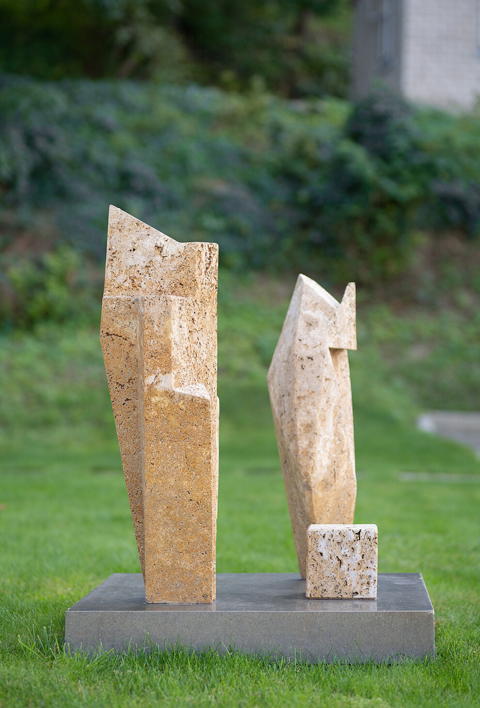 "Геометрична архаїка" Олексія Золотарьова була створена в 2012 році з тибурського каменю. Твір нагадує нам про непорушні цінності — про сім'ю як про об'єднуючу форму, що складається з елементів, окремих у минулому. Ідею втілено за допомогою геометричної композиції — так виражається можливість трансформацій. Чіткість фігур підкреслює надійність цієї форми існування.