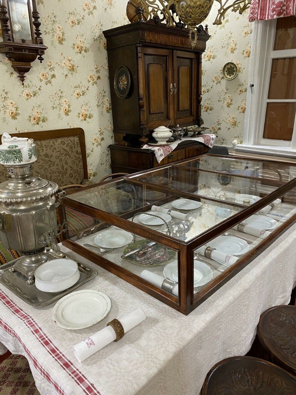 Дім-музей Михайла КоцюбинськогоУ їдальні сервіровано стіл: лляні серветки з вишитими ініціалами кожного з восьми мешканців будинку (письменник, його дружина, троє дітей, сестра), цукорниця і щипці для цукру, білий порцеляновий посуд, підставки для яєць.