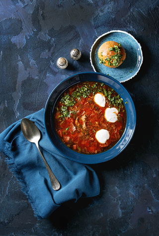 Перед поданням розігрійте його, але не кип’ятіть, бо втратить колір. Подавайте у чашечках. Щоб борщ на столі швидко не вистигав, чашечки рекомендуємо попередньо нагріти в гарячій воді.