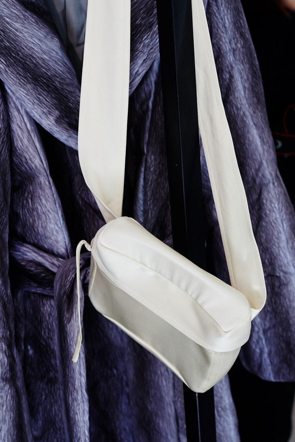 Спорт в колекції Bevza виражений не тільки в пуховиках, але і в поясних сумках. Але зроблені вони тут з благородного сатину і на званій вечері будуть точно виглядати доречно. Тим паче, що деякі тренчі і пальта дизайнерка доповнила непомітними прорізами на спині, щоб таку сумку можна було без проблем одягнути на верхній одяг.