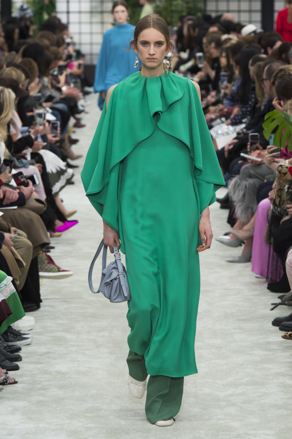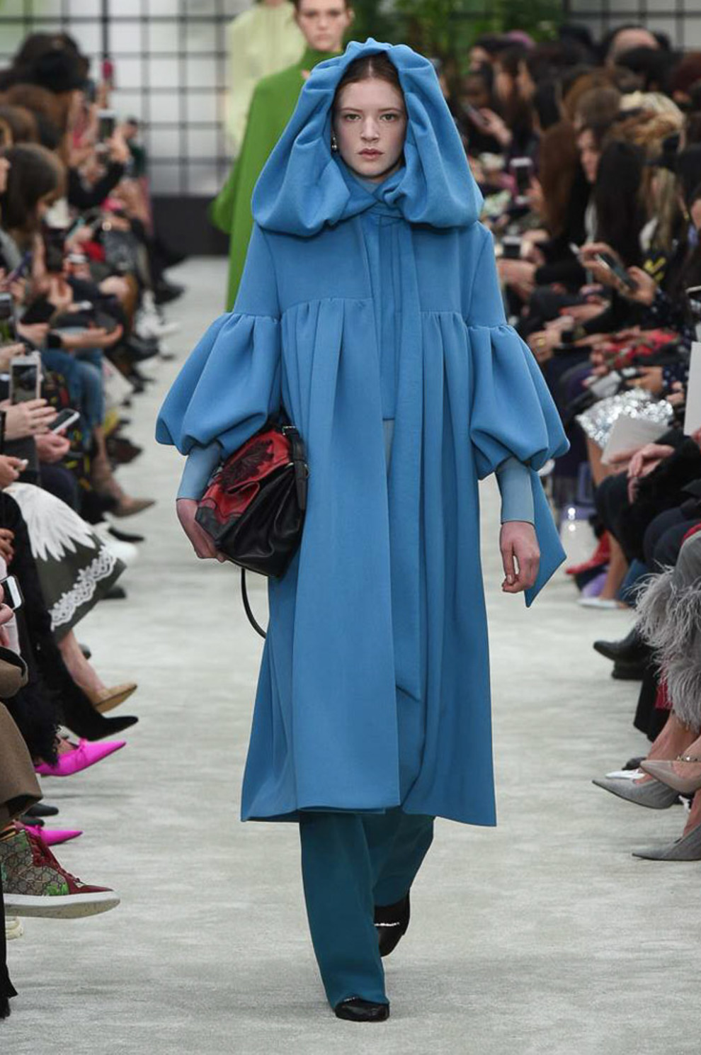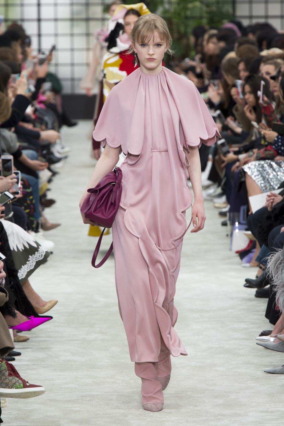 Valentino осінь-зима 2018/19Трепетні пелюстки квітів, повітряні шари тканин, художні зубчасті краї й складне поєднання відтінків. Повністю закриті сукні-футляри, A-line-силуети пальт, шовкові хустки, що покривають волосся й казкові накидки з гігантських пелюсток – сам того не бажаючи дизайнер створив найкрасивішу й одночасно найбільш контрастну щодо інших колекцій на Тижні моди в Парижі.