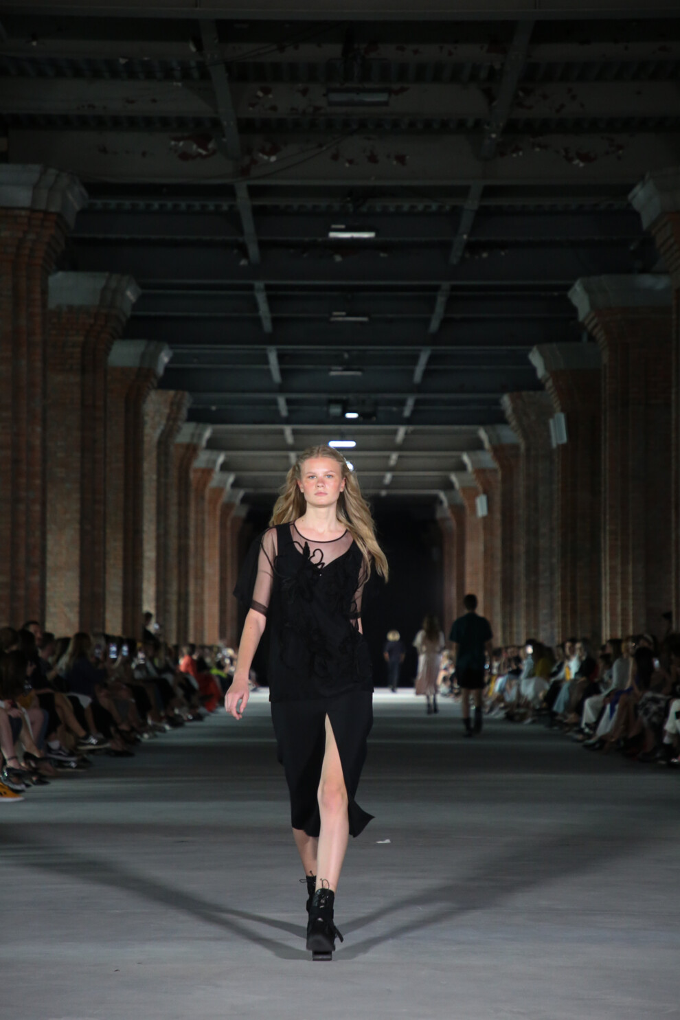 Свої головні хіти – фігуристі сукні з декольте і вбрання з нюдового шифону для дівчат, які живуть життям у стилі Tatler, – Климчук вирішив приберегти на потім. Їх він покаже окремо, в жовтні. Те, що побачила публіка під склепіннями Мистецького Арсеналу в суботу, – це ARTEMKLIMCHUK Light, полегшений і більш реалістичний одяг. Дизайнер відправив на подіум дівчат і хлопців (він каже, що велику частину чоловічої пропозиції носитимуть жінки-клієнтки) в масивних куртках з накладними кишенями, фігуристих чорних сукнях і прозорих футболках з сітки. Абстрактні квіткові візерунки, вишиті оксамитовою ниткою і стеклярусом, розробила архітектор, художниця і колись модель показів Артема, Поліна Мороз. Її тонка графіка надала вбранням Климчука потрібного градусу лиску, але не порушила їхню легкість.