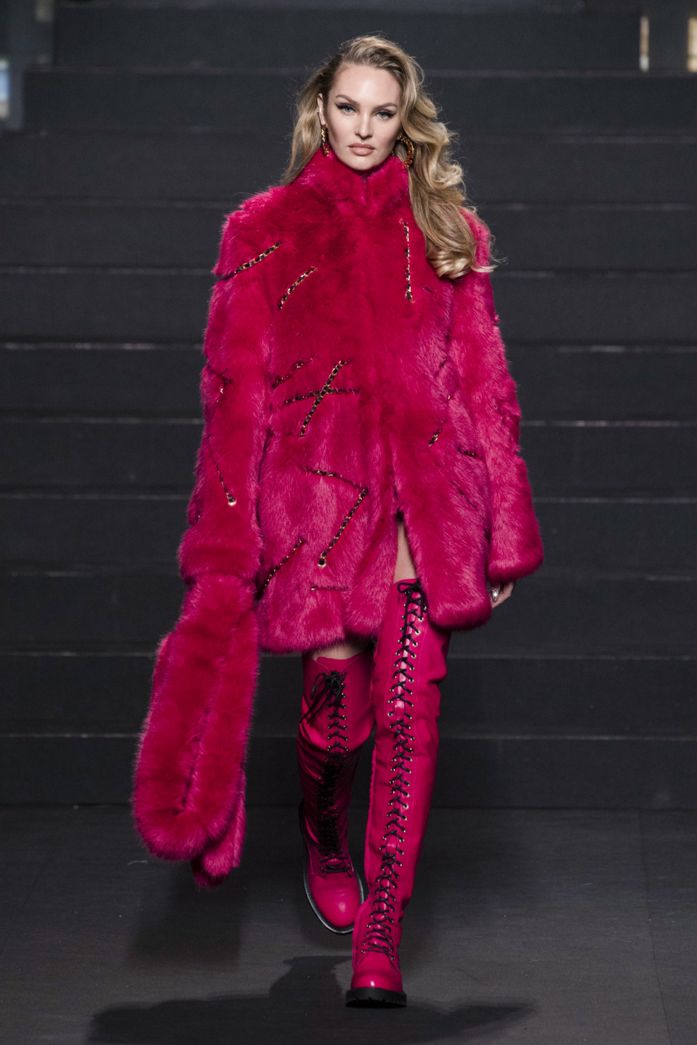 Moschino x H&MПоказ H&M [tv] MOSCHINO обставили як посвяту Нью-Йорку – в глибині залу збудували бродвейську сцену з конструктором багатоповерхівок, на величезних екранах з Times Square транслювали великі плани моделей. На подіумі – гримуча суміш з стріт-кастингу і найсексуальніші дівчата планети: сестри Хадід, Кендіс Свейнпол та Ізабелі Фонтана. Закривала показ непереможна Наомі Кемпбелл у сукні гламазонки під гімн New York Аліші Кіз.