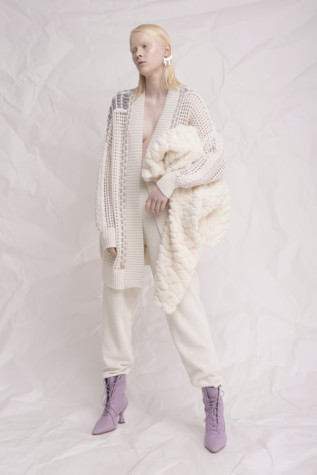 Серед декоративних рішень – різноманітне використання корсетних кісток і ліній, відкриті плечі, стяжки і призбірки, які подорожують з сукні на сукню. Матеріали, представлені в колекції – шерсть, шовк, сатин, жатий котон, віскоза і купра, екоматеріал, з якого пошитий чорний блискучий костюм, який обіцяє стати знаковим образом колекції.