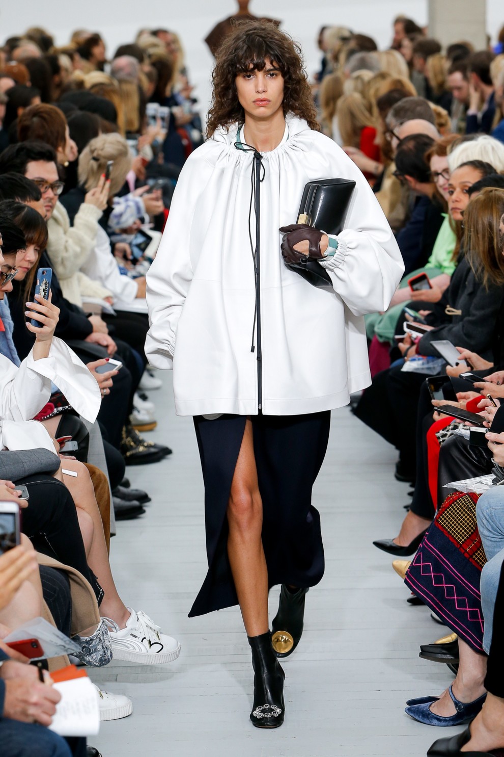 Isabel Marant весна-літо 2018Подивитися як поєднувати широкий верх і вузький низ можна в одній з ключових колекцій сезону – Celine. Фібі Файло показує як "подружити" вулицю і червону доріжку. Вона поєднує разом довгу спідницю з високим розрізом і об'ємну парку на зав'язку.
