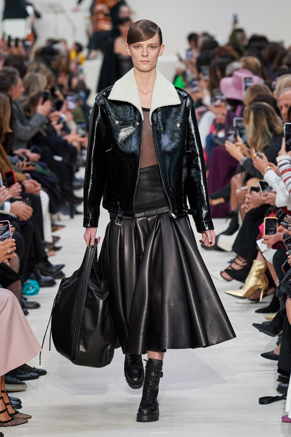 Brandon MaxwellГоловним декоративним елементом на куртках цієї осені є хутряний комір. У колекціях брендів можна побачити пухнасті, ворсисті або гладкі варіанти на шкіряних бомберах і байкерських куртках. Chloe запропонували стильну темно-зелену куртку в стилі ретро, запозичену з гардероба пілотів, з м’яким коричневим коміром, Khaite продемонстрували бордовий бомбер з білим ворсистим коміром, а Valentino показали чорну байкерську куртку з овечим, гладко стриженим коміром.