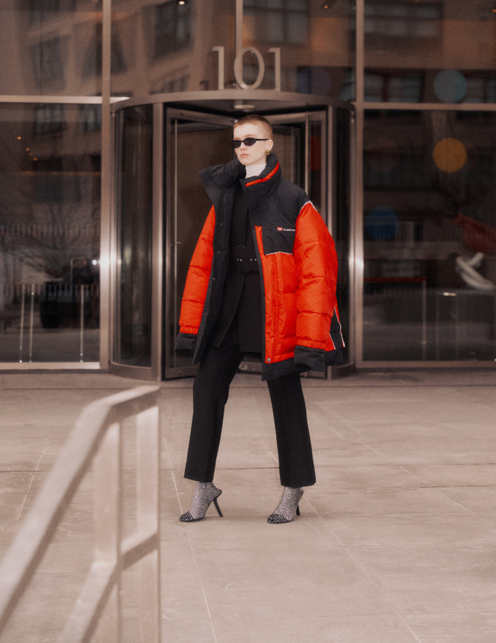 Бомбер з нейлону, чобітки, розшиті паєтками, серпежки, латунь, усе – Balenciaga; жакет і брюки з бавовни і еластану, все – Marina Moscone; оакуляри, MYKITA