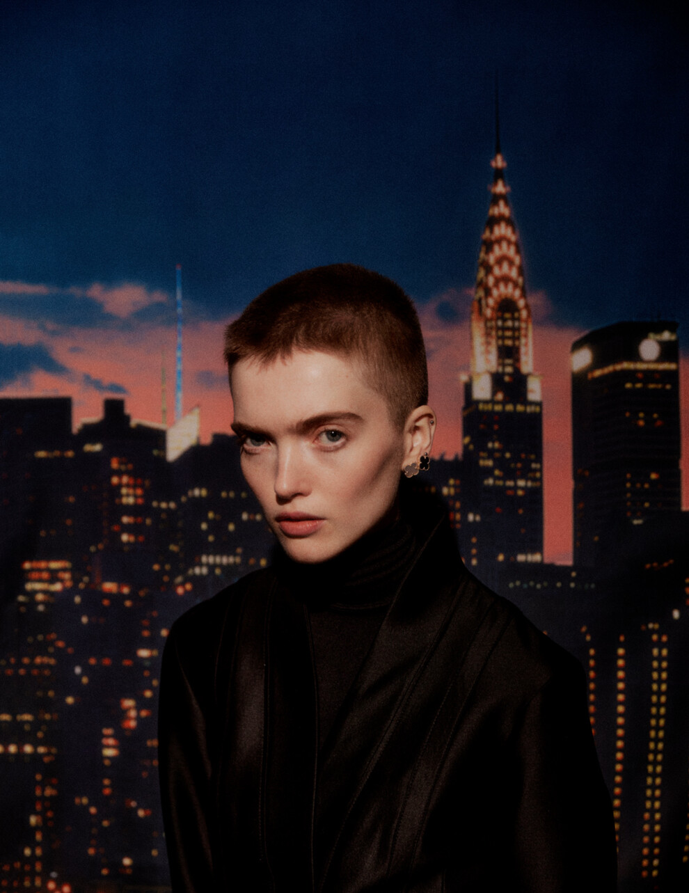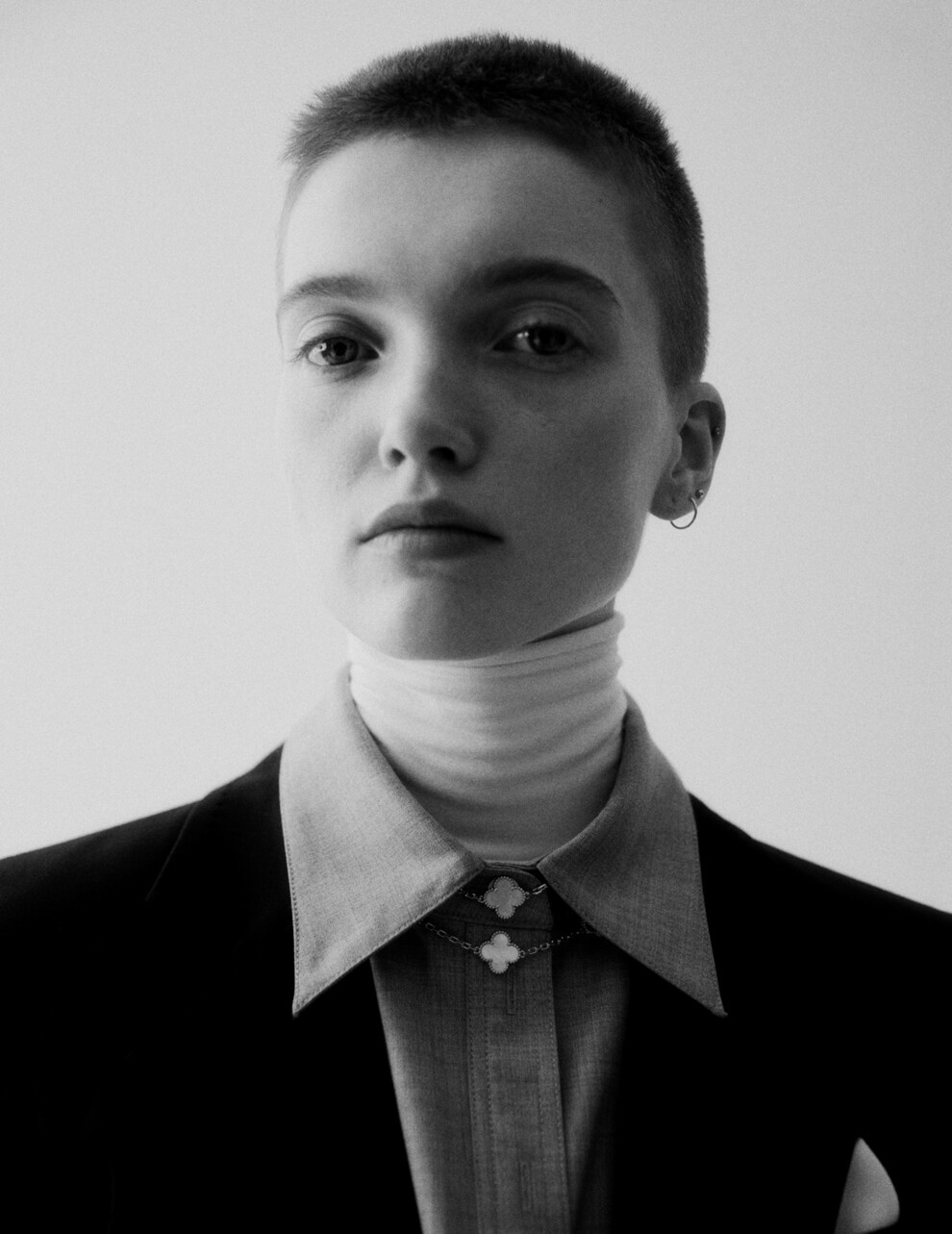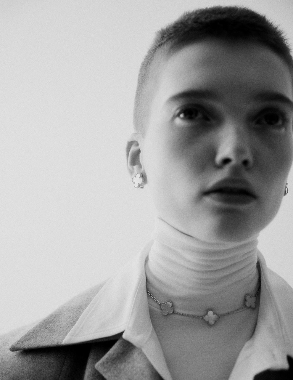 Вовняний жакет, Max Mara; бавовняна сорочка, Brunello Cucinelli; два кольє, жовте золото, перламутр, усе – Van Cleef & Arpels; бавовняна водолазка, власність стиліста; сережки, власність моделі