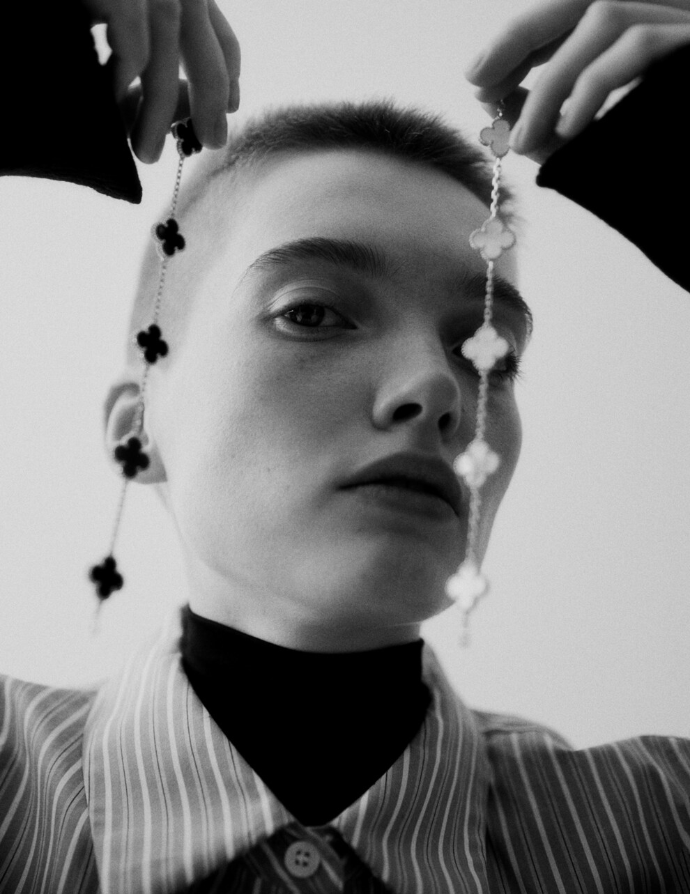 Сорочка з віскози, Dries Van Noten; браслет, жовте золото, онікс, браслет, жовте золото, перламутр, усе – Van Cleef & Arpels; бавовняна водолазка, власність стиліста