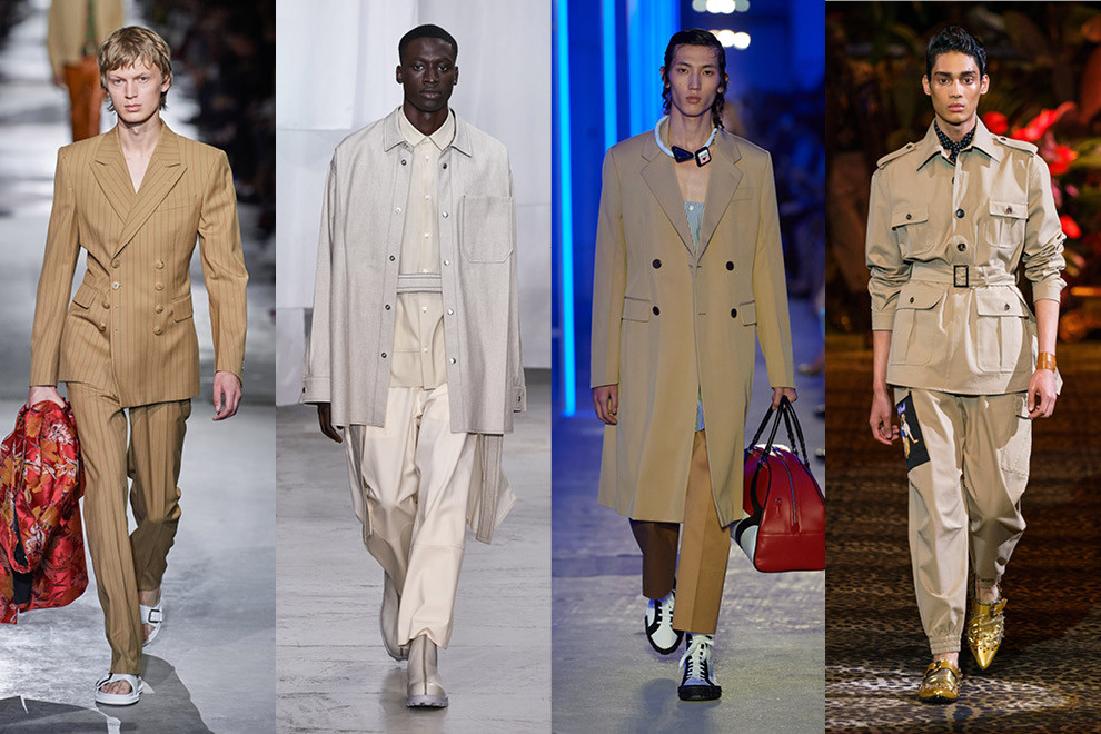 Dries Van Noten, Jil Sander, Prada, Dolce & GabbanaНейтральна палітра кольорів відсилає до найкращих сарторіальних традицій чоловічої моди. У пошані лаконічний одяг усіх відтінків пустелі: пальта й тренчі з бежевої шкіри та замші, точені пісочні костюми й брючні комплекти для сафарі. У них легко походити на відважного легіонера й респектабельного жителя XVI арондисмана — кому що більше до смаку.