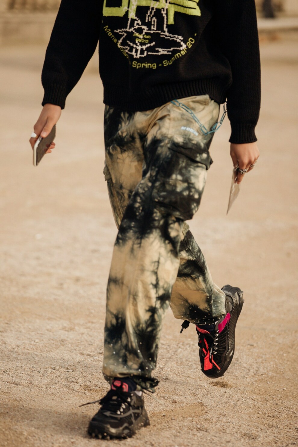 Порада 3: штани карго з принтом тай-дай у поєднанні з рисунчастим джемпером і кросівками.